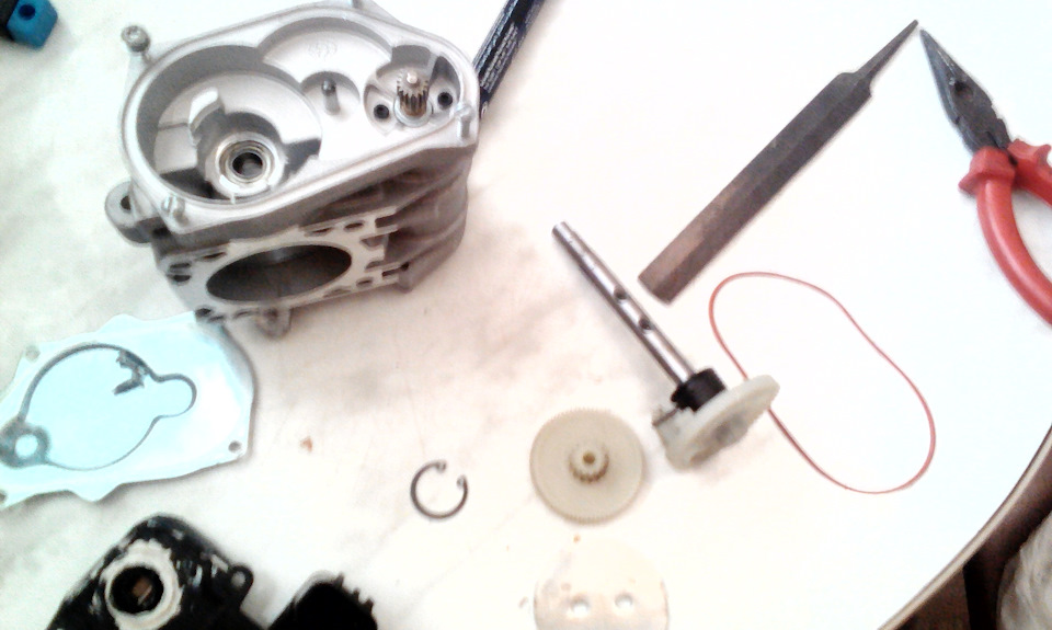 Суть предлагаемого мной способа устранения люфта состоит в том, чтобы немного раздвинуть усы пружины на величину зазора, проточив, например надфилем, канавки под усы в пластиковых упорах на самой шестерне.